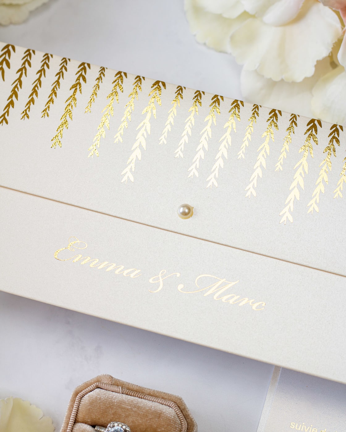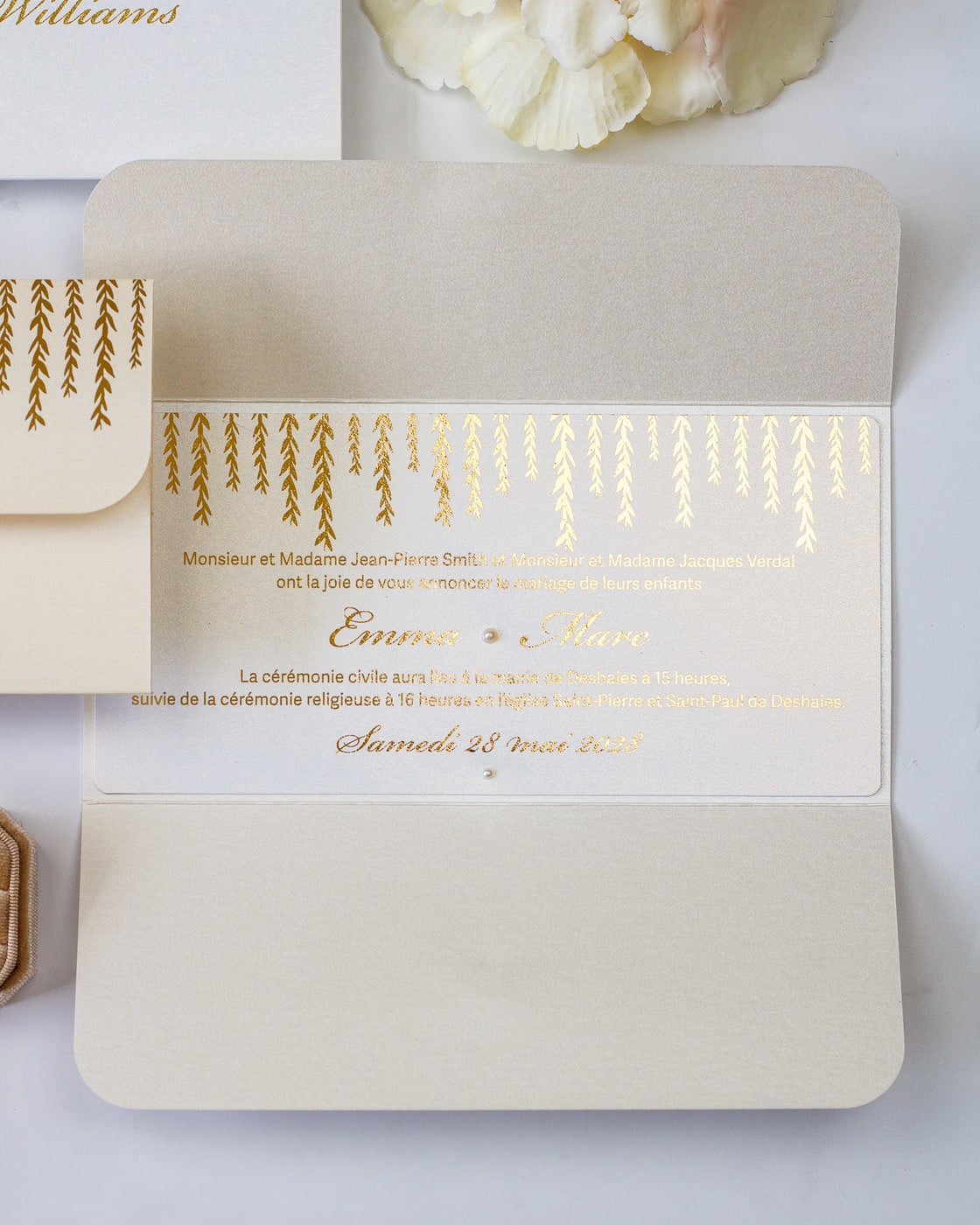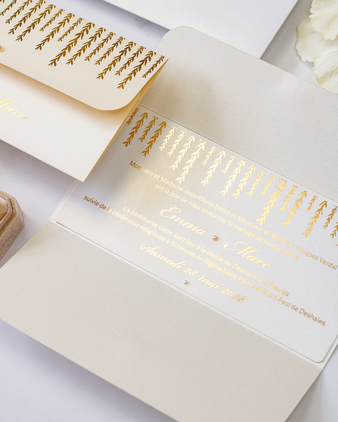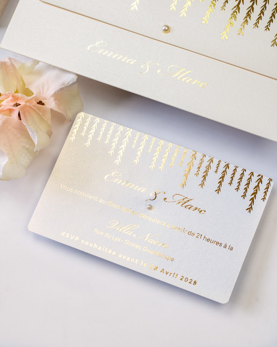 Faire-part de mariage simple et élégant sublimé par la dorure et orné d'une perle blanche.