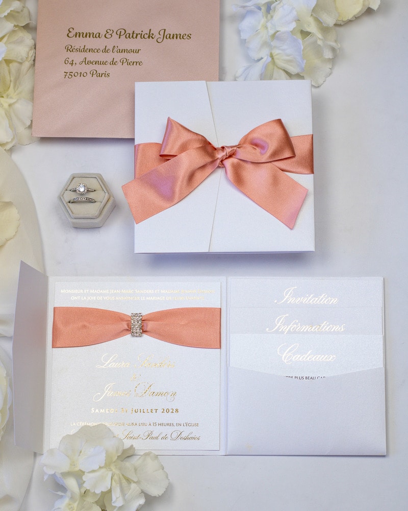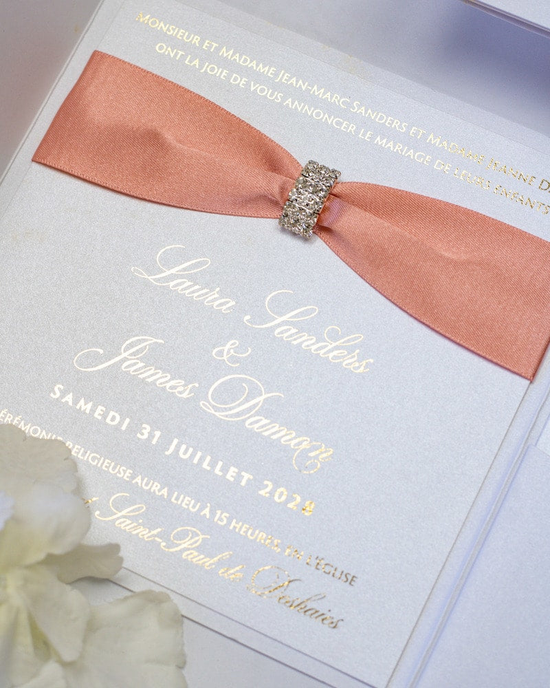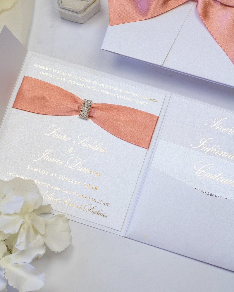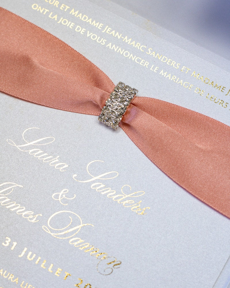 Magnifique faire-part de mariage chic et tendance, fermé par un large ruban en satin, et sublimé à l'intérieur par un autre ruban orné d'une boucle strass.