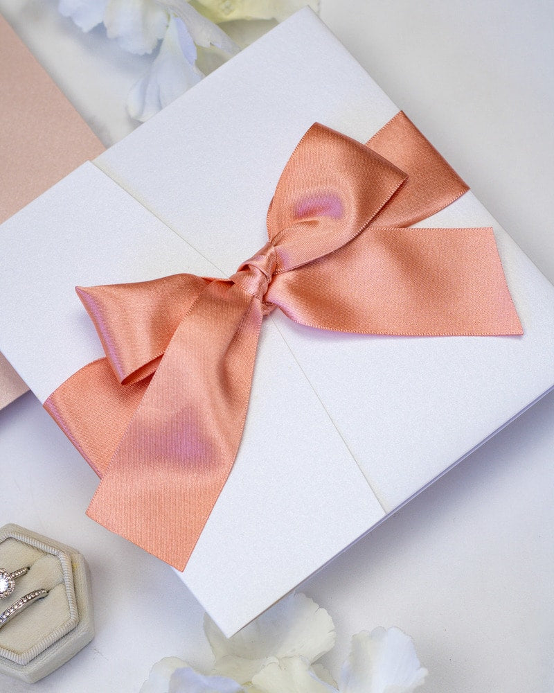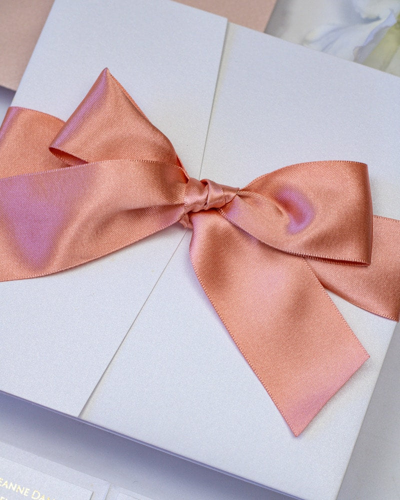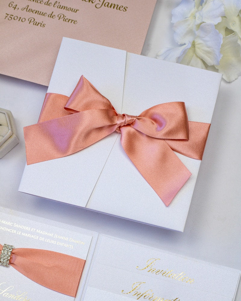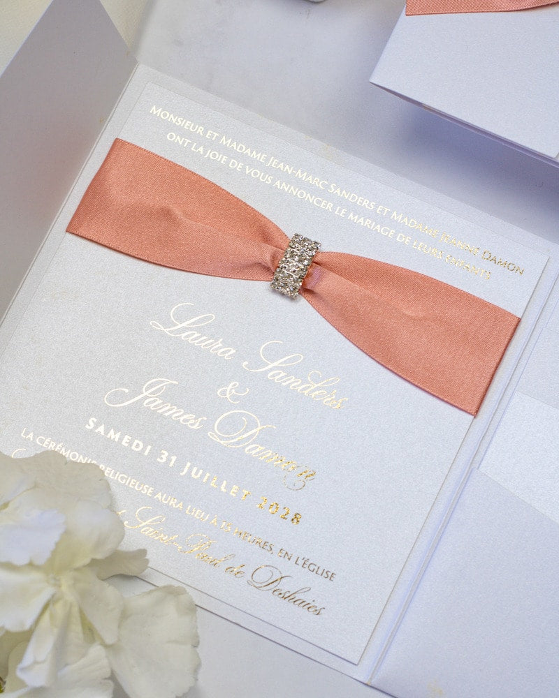 Magnifique faire-part de mariage chic et tendance, fermé par un large ruban en satin, et sublimé à l'intérieur par un autre ruban orné d'une boucle strass.
