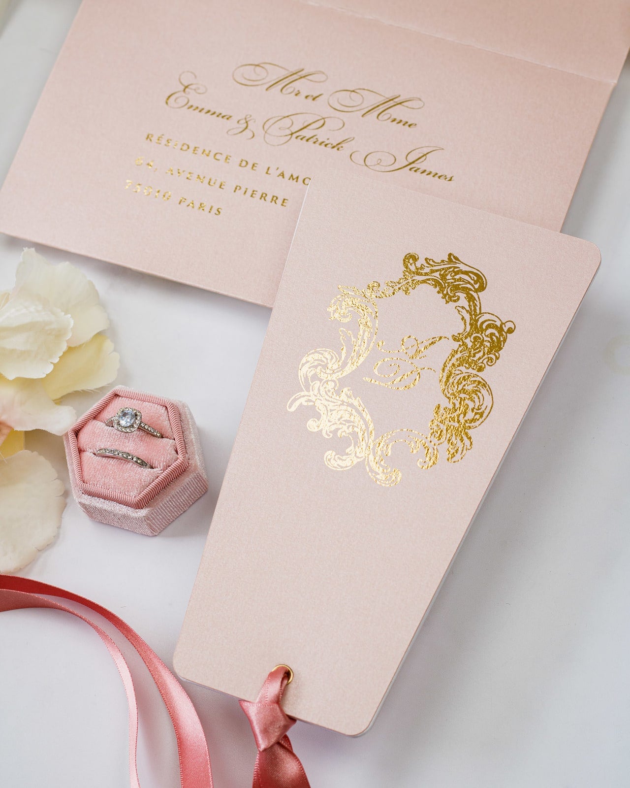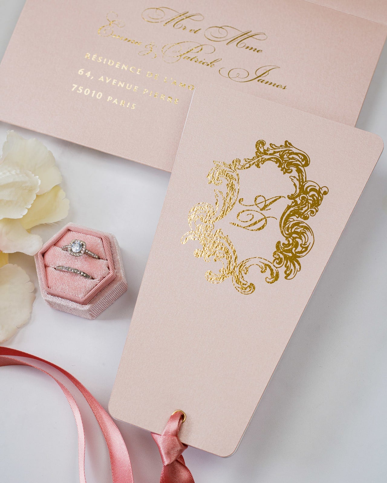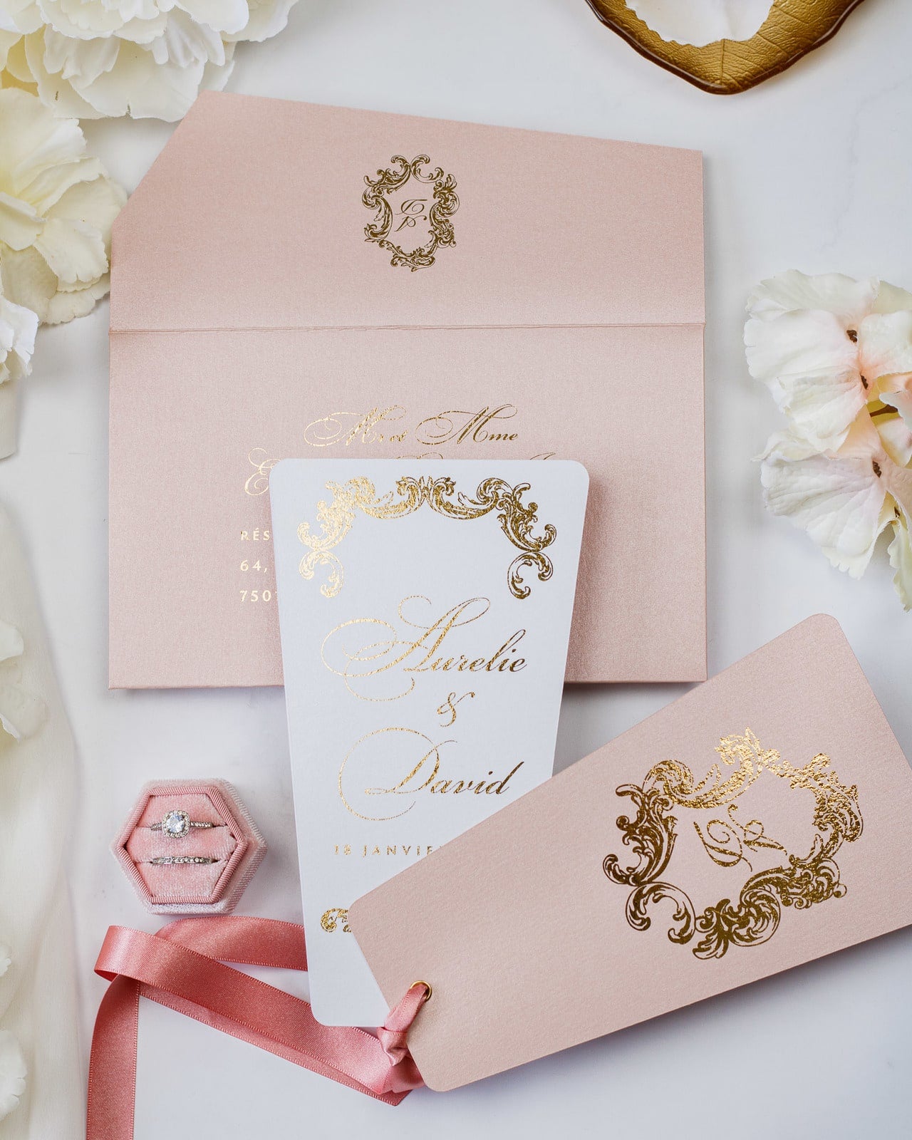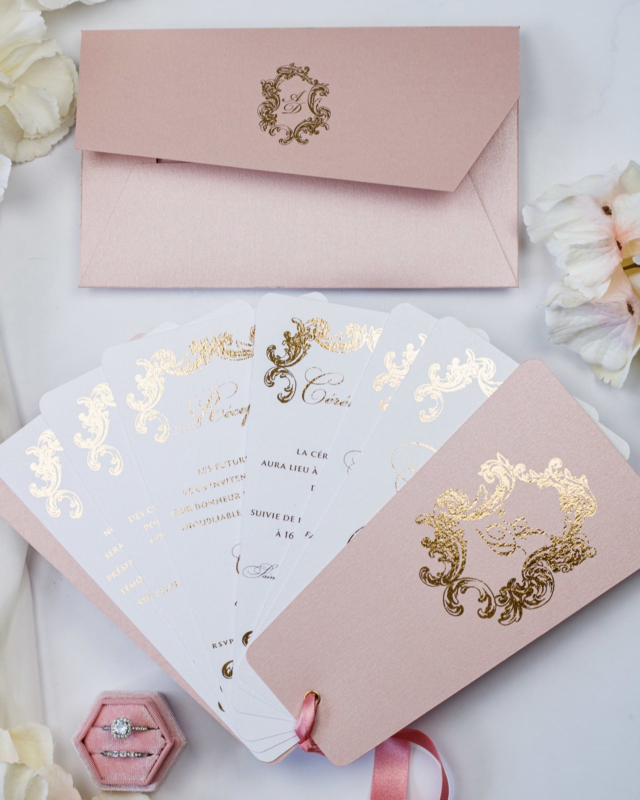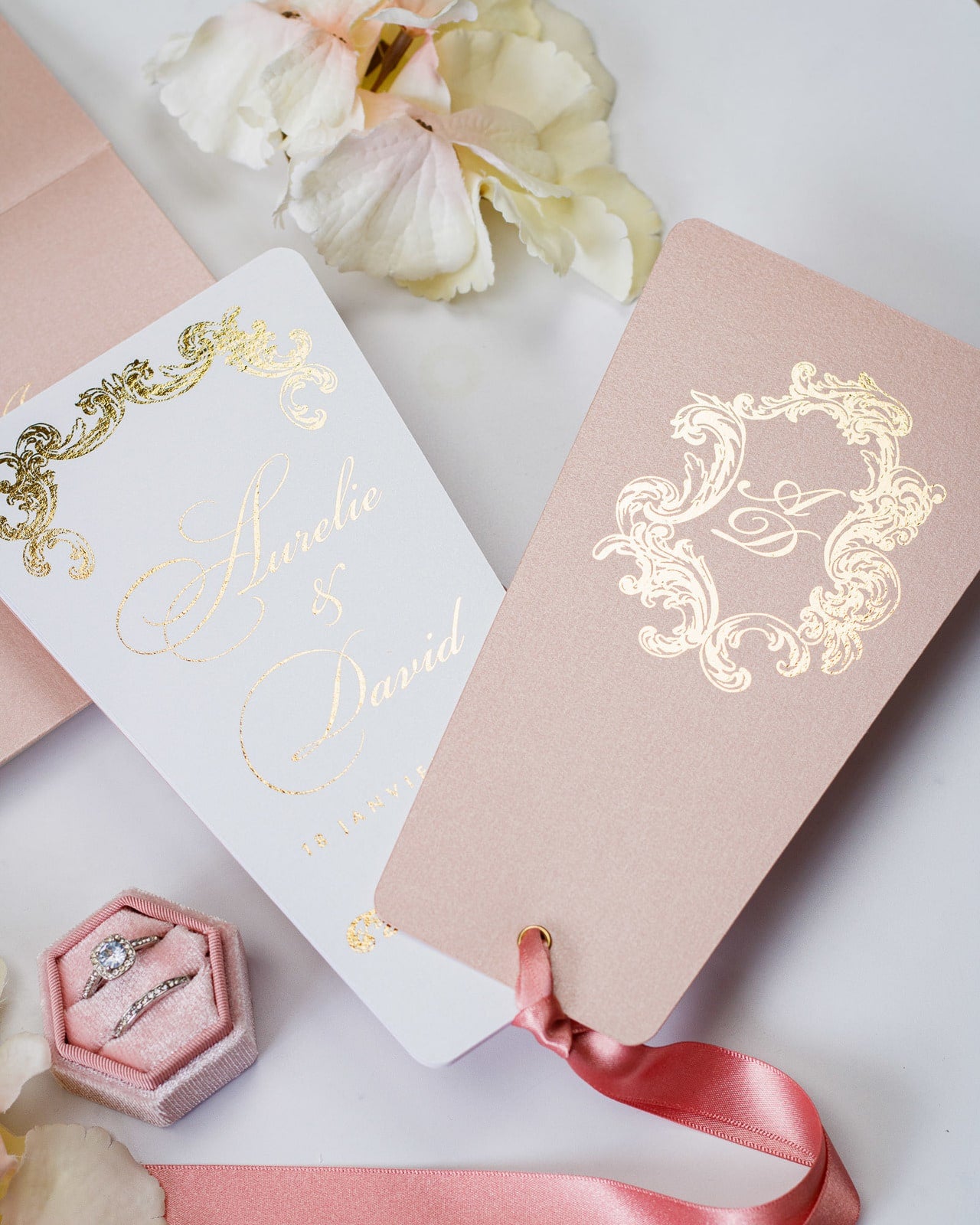 - Enveloppe : Rose or / Blanc / Bleu nuit