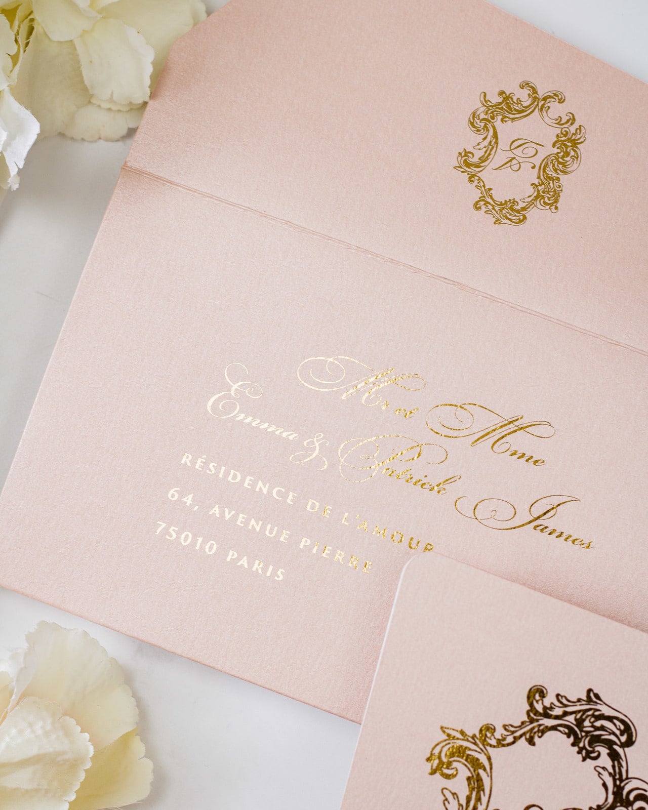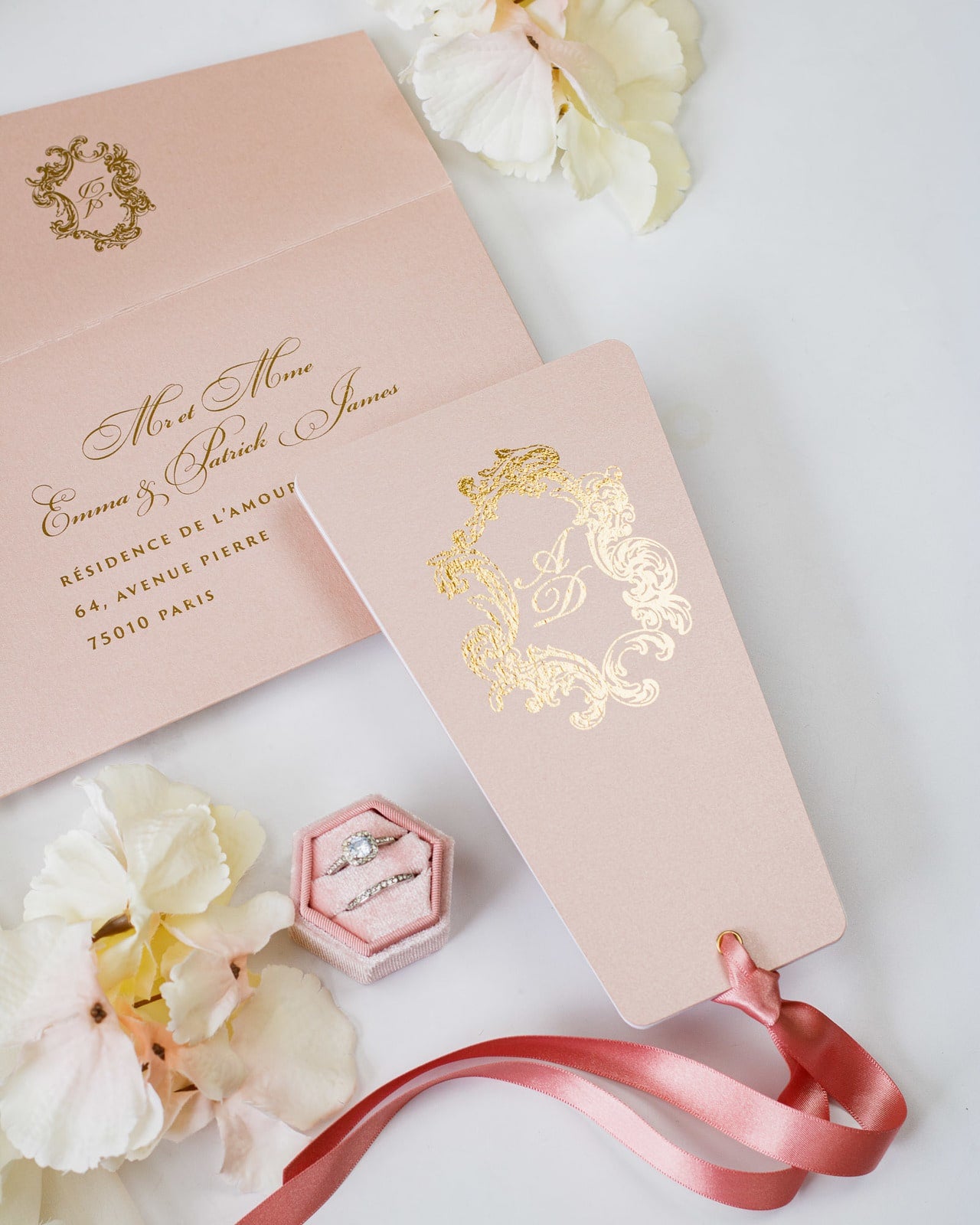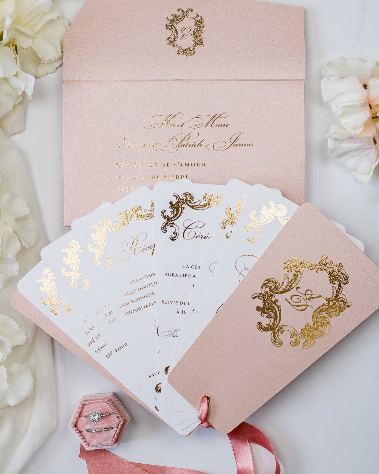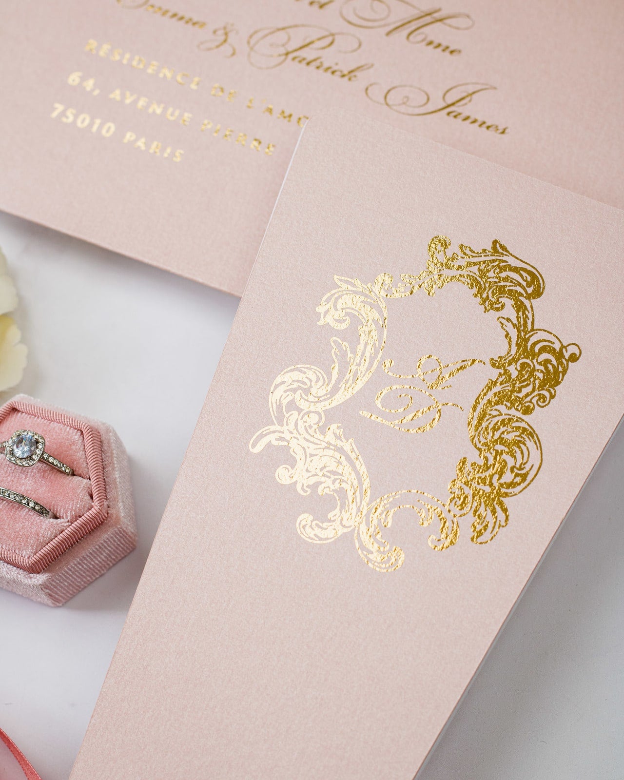- Enveloppe : Rose or / Blanc / Bleu nuit