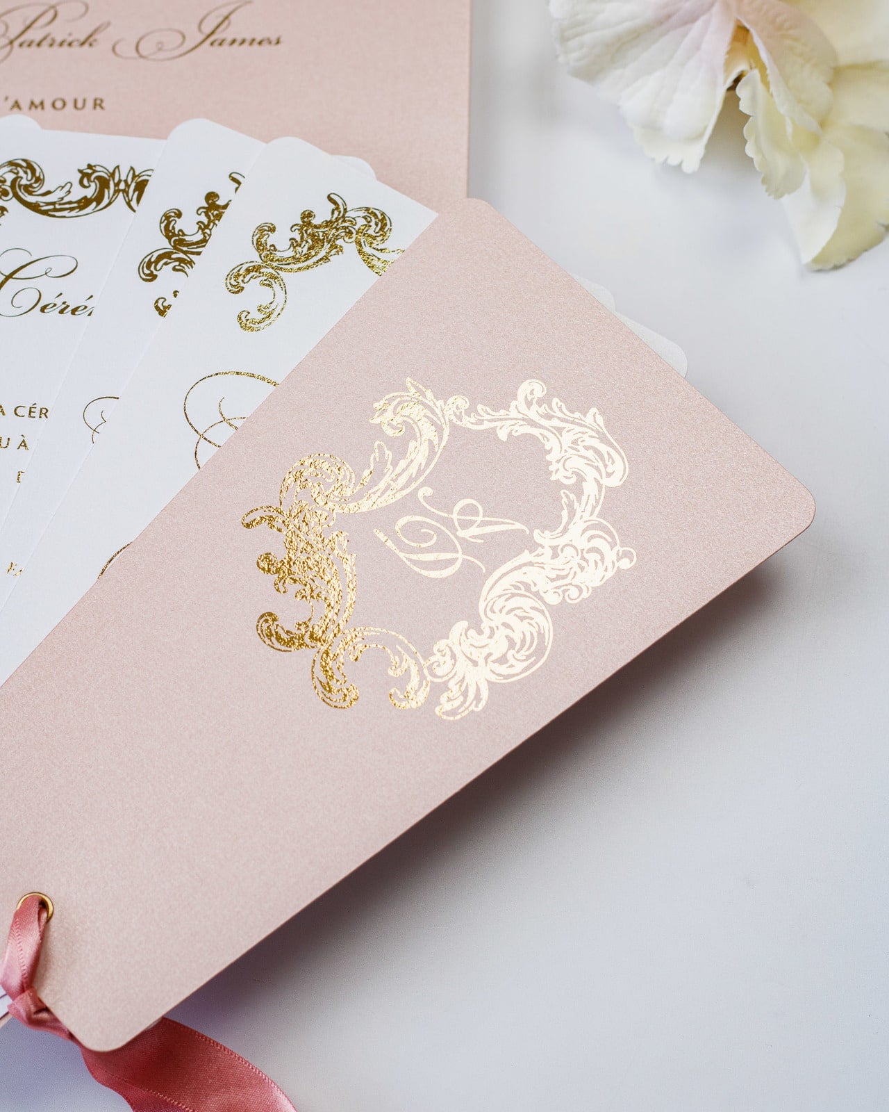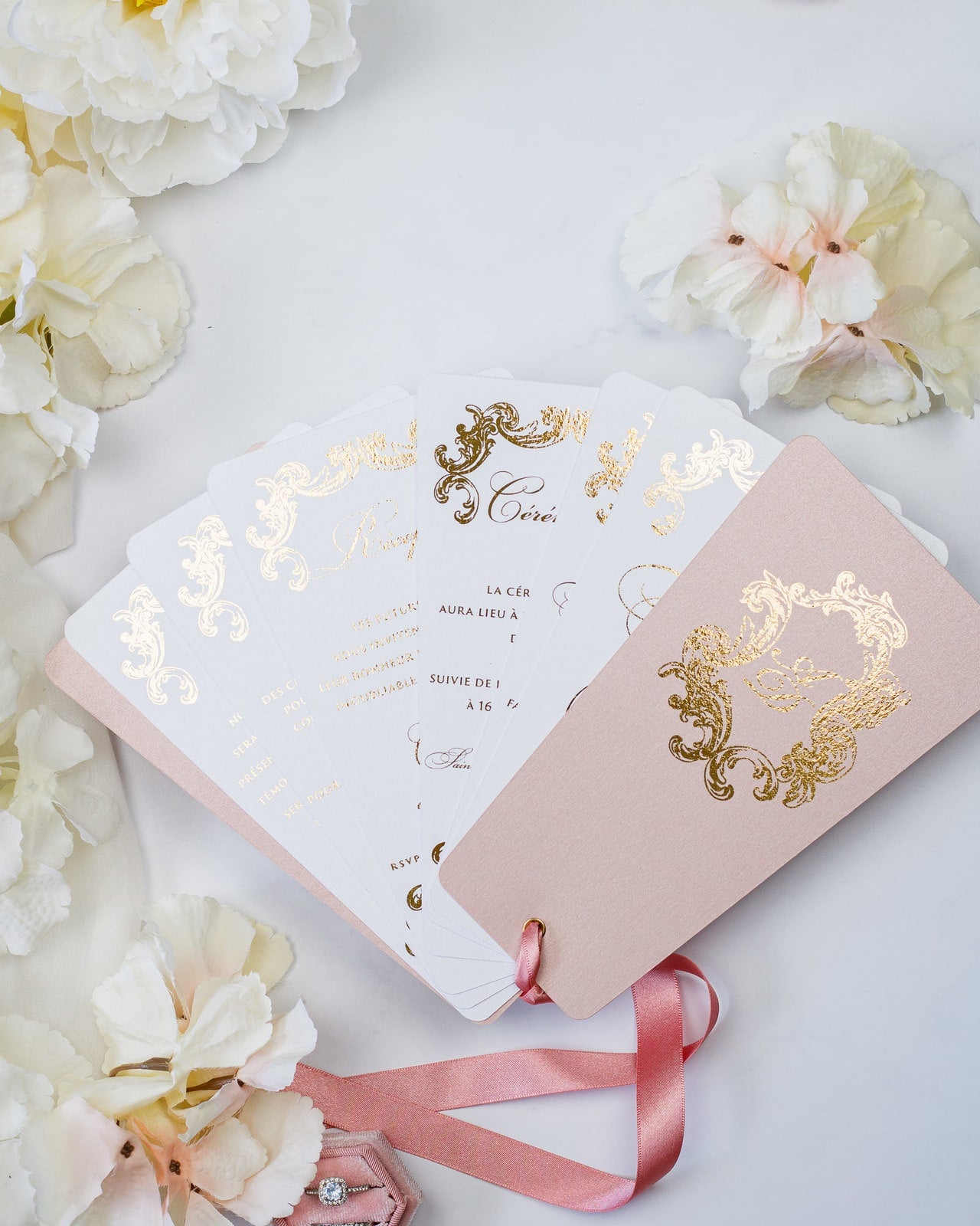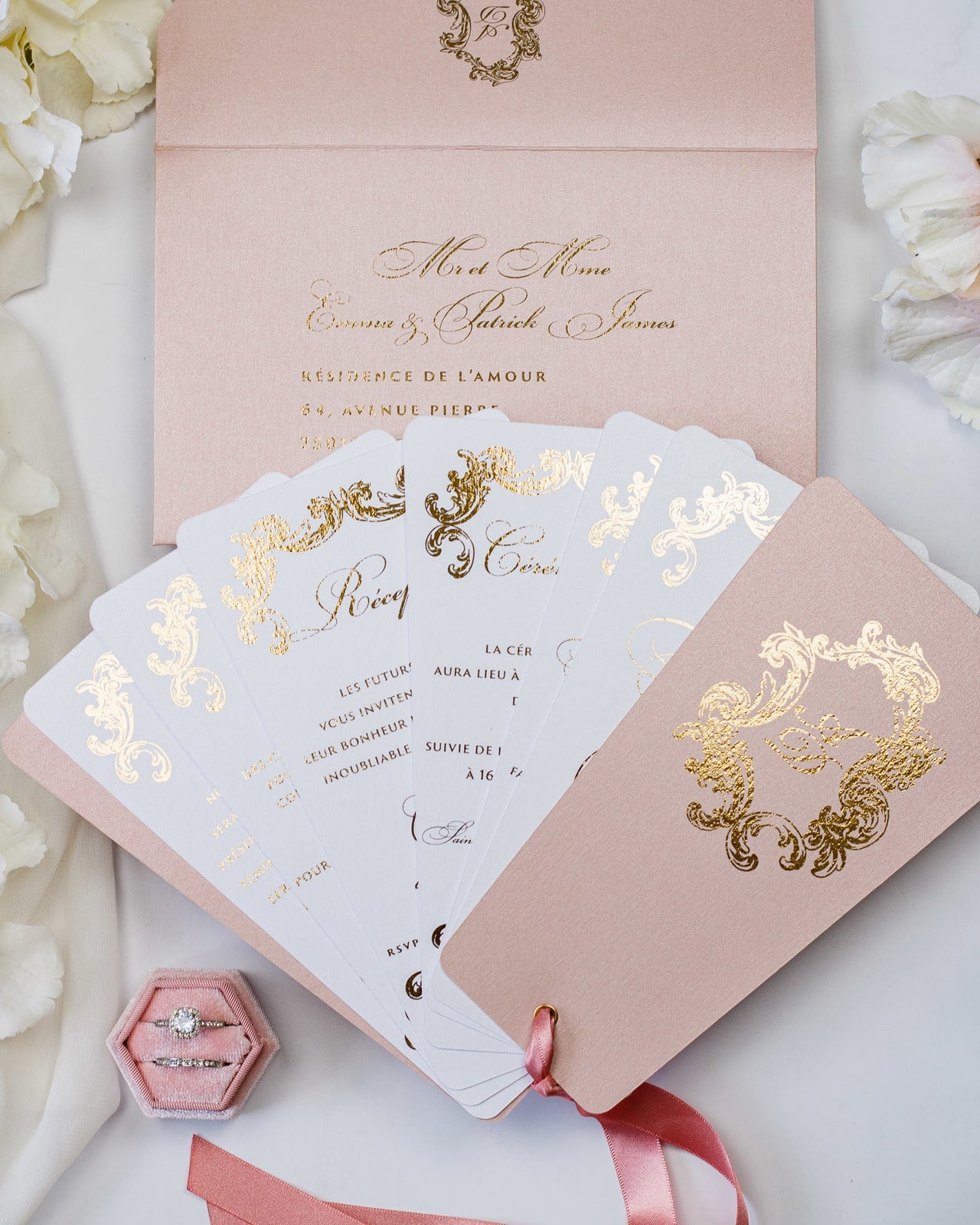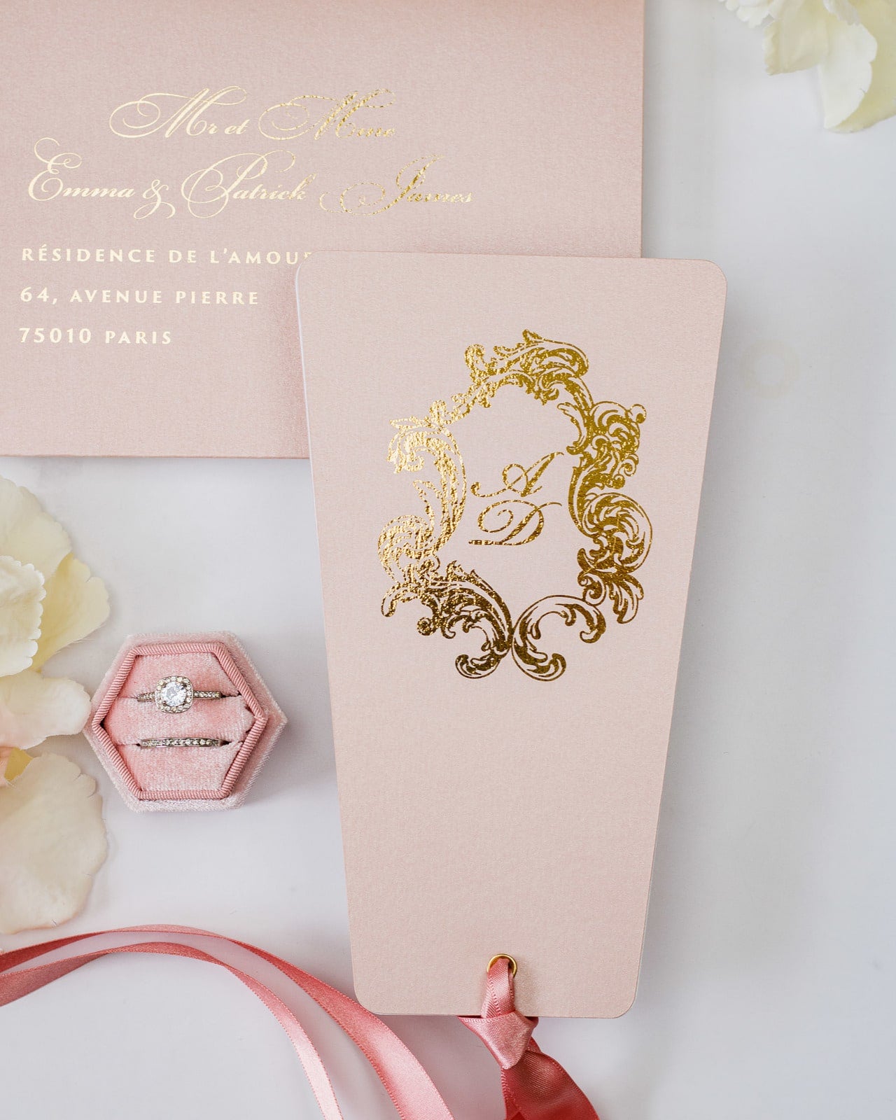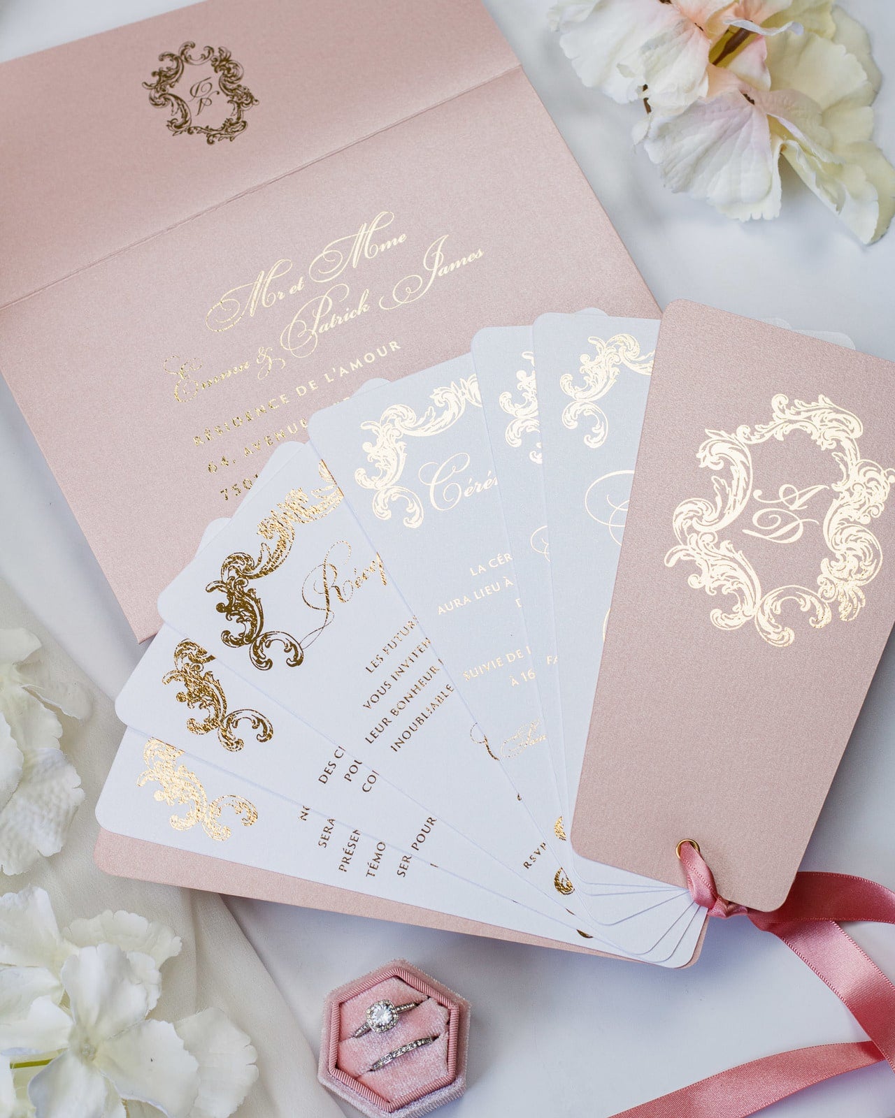 - Enveloppe : Rose or / Blanc / Bleu nuit
