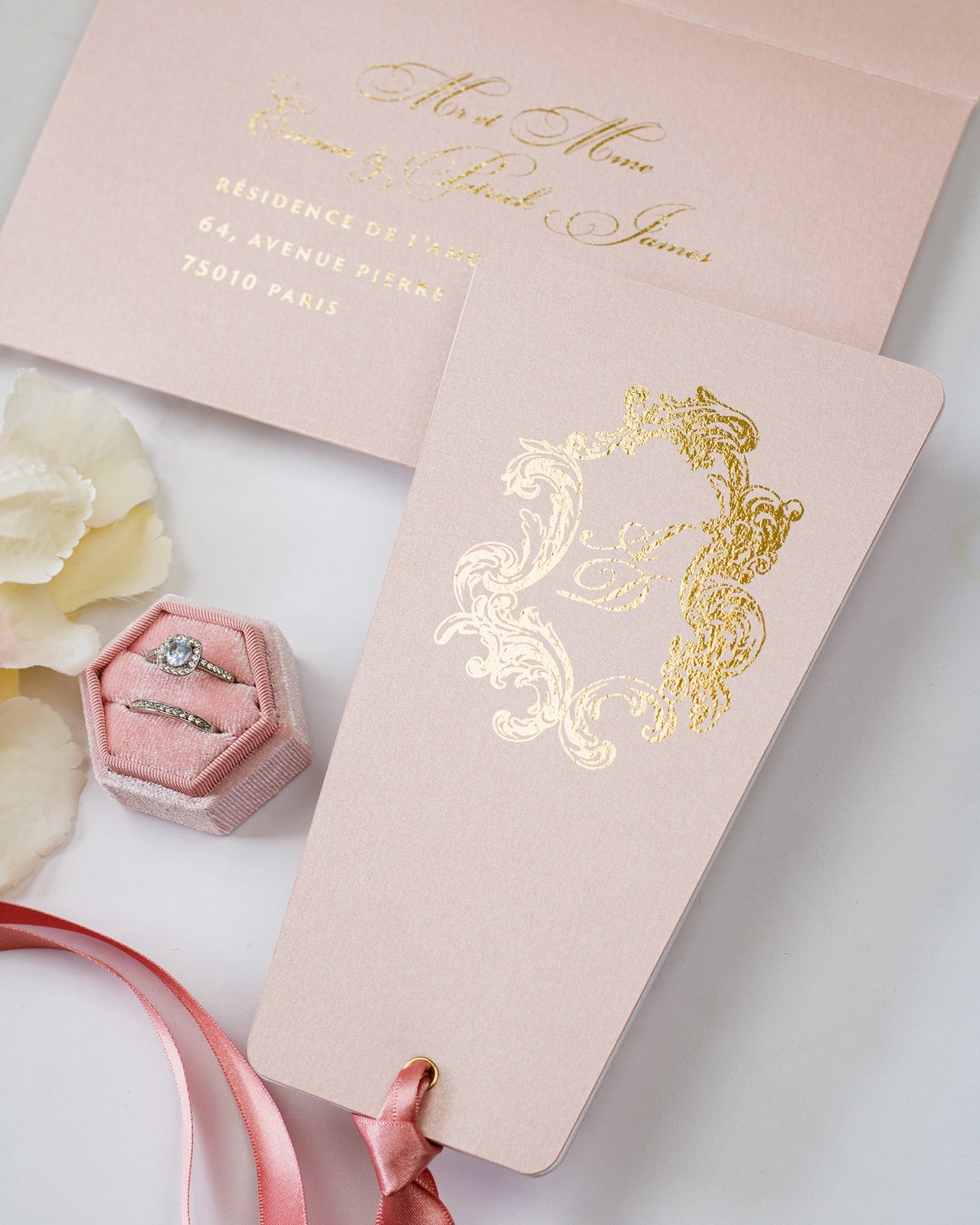 Elégant faire-part de mariage chic et romantique, sublimé par un beau ruban en satin et sa finition dorure.