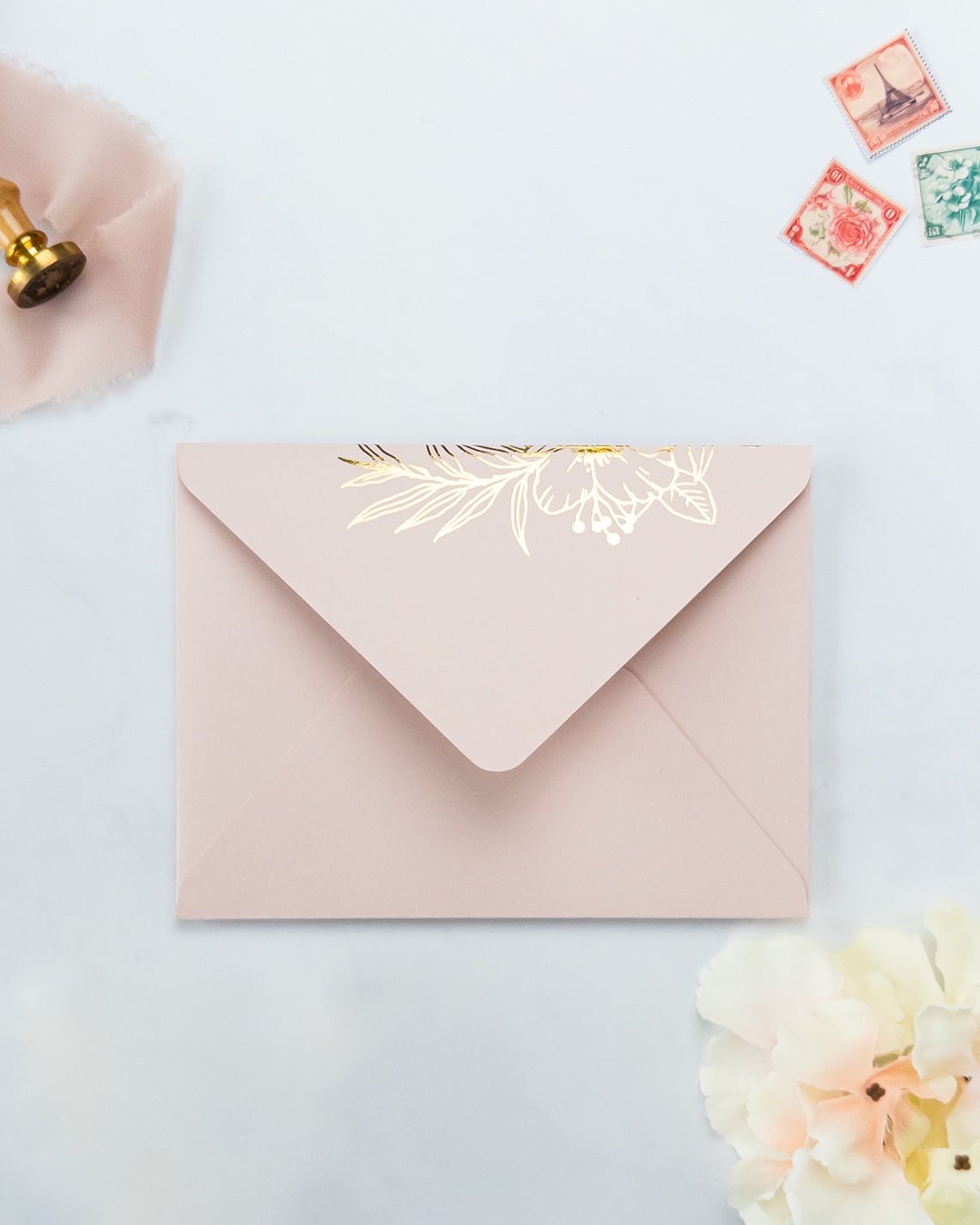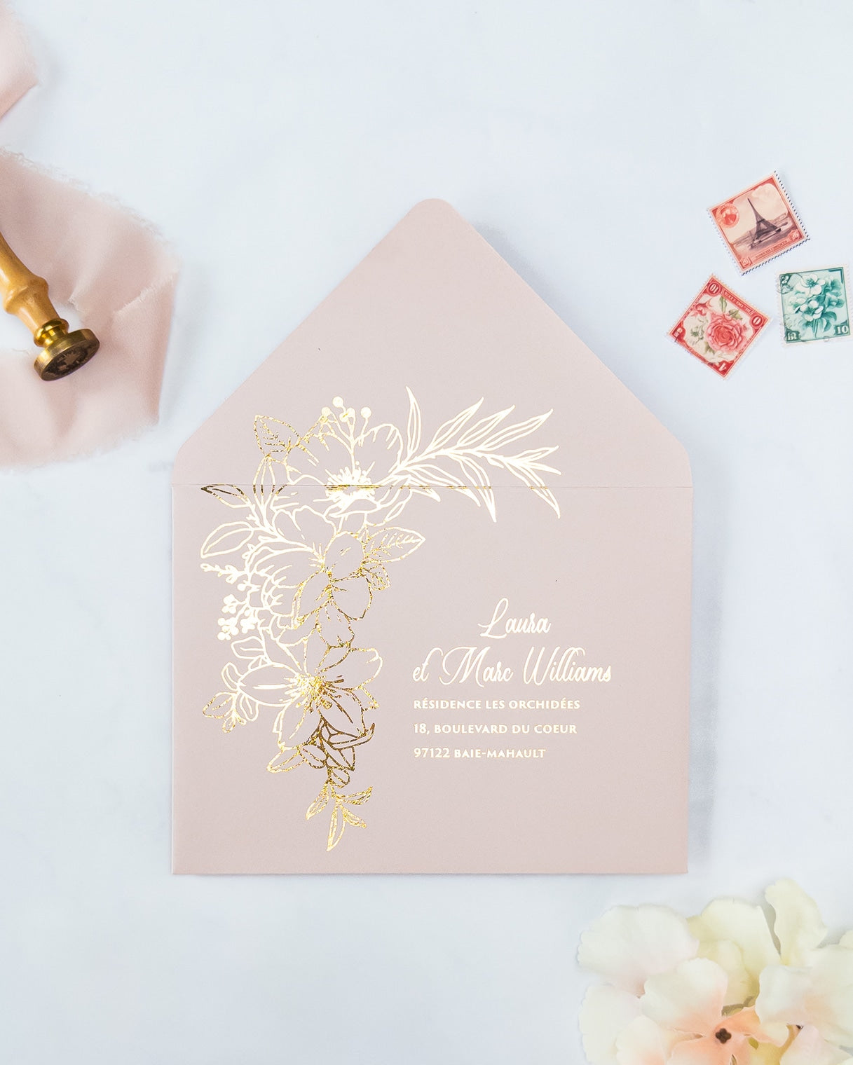 Nos enveloppes chics et élégantes, sont entièrement faites à la main avec amour et soin. Laissez-nous éblouir vos invités pour votre grand jour !