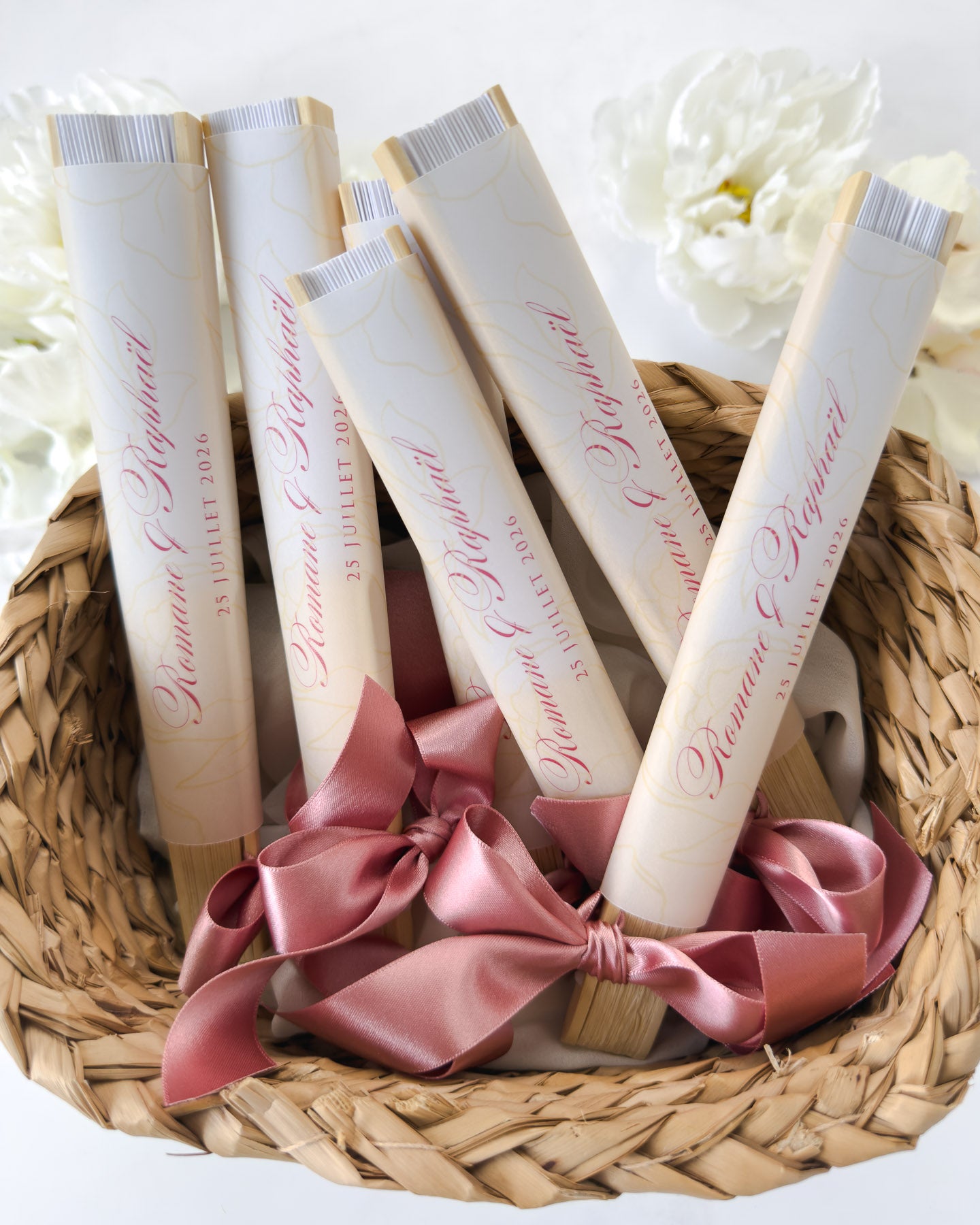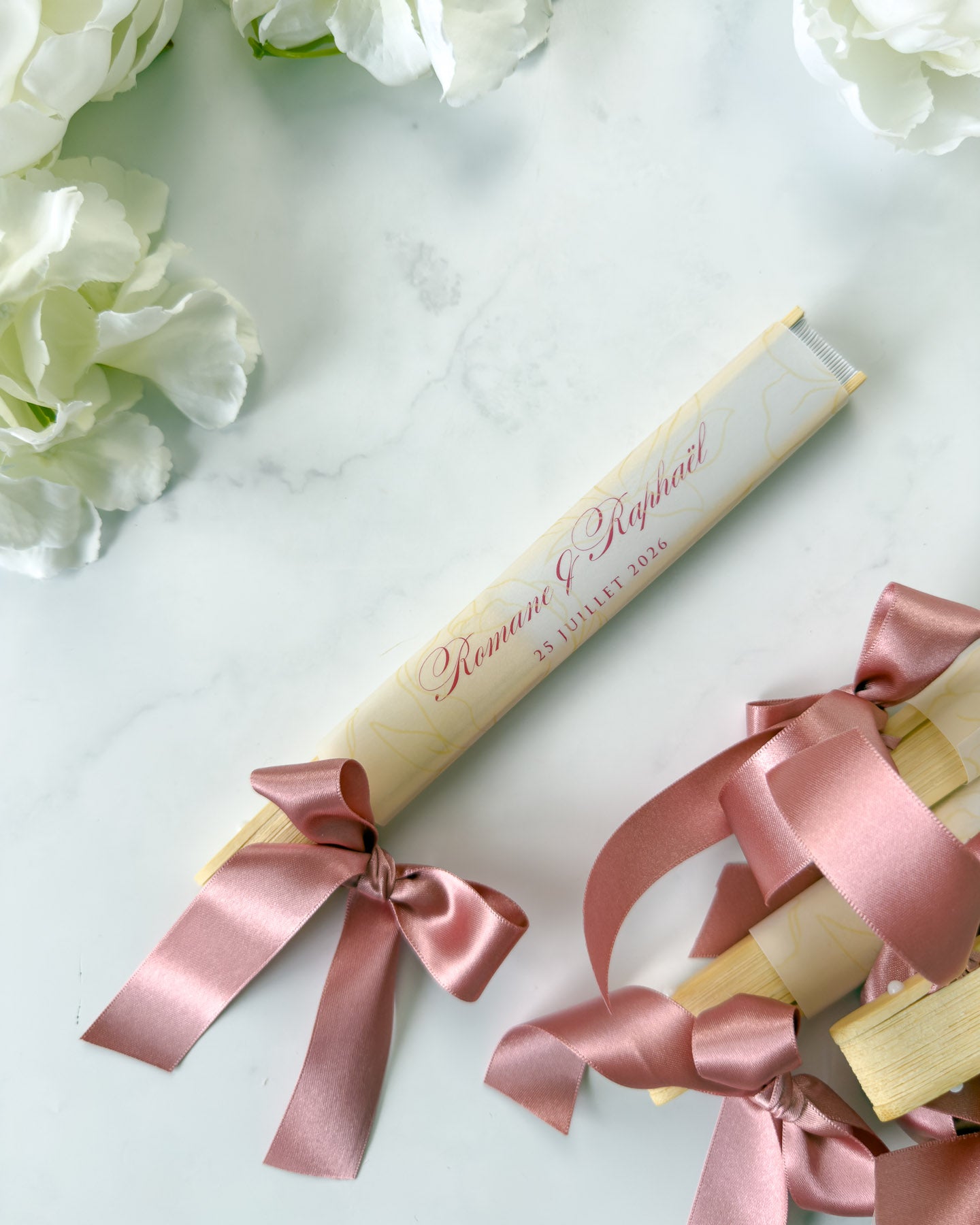 A distribuer à l’entrée de votre lieu de cérémonie, ou à placer dans un grand panier à la disposition de chacun. Ils donnent le ton de votre thème de décoration.
