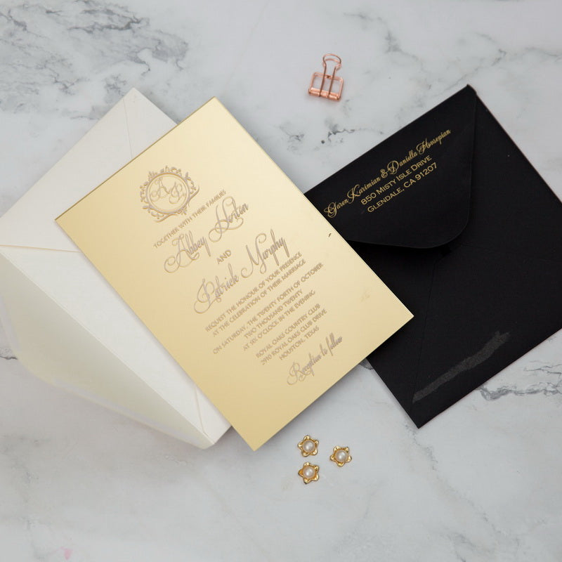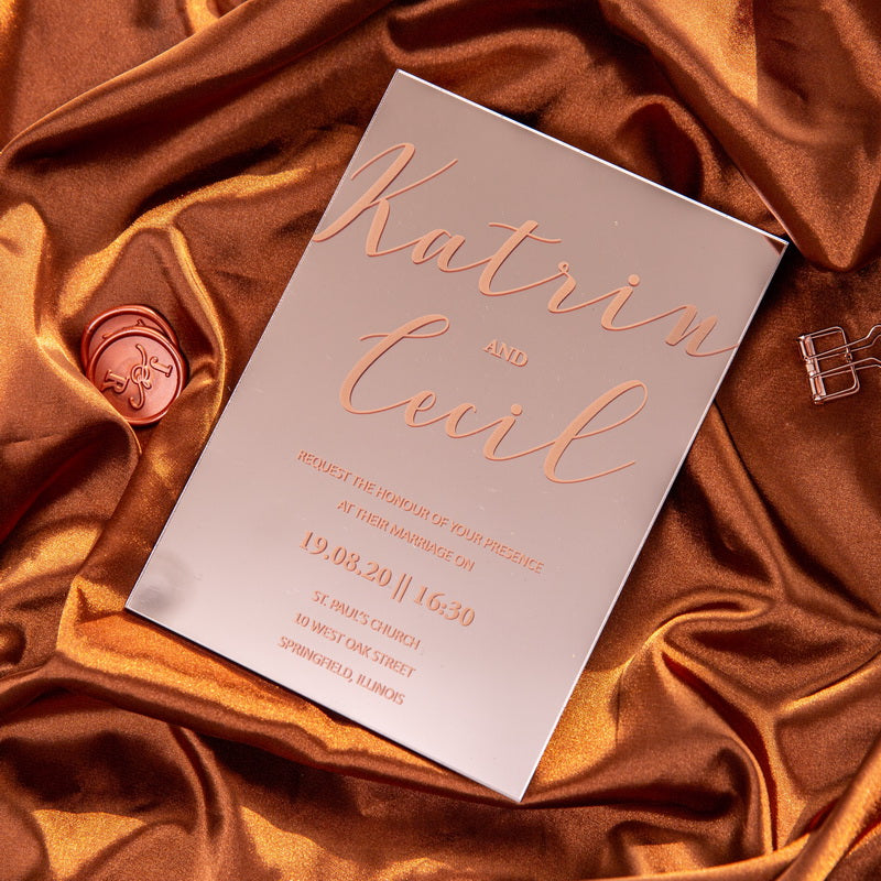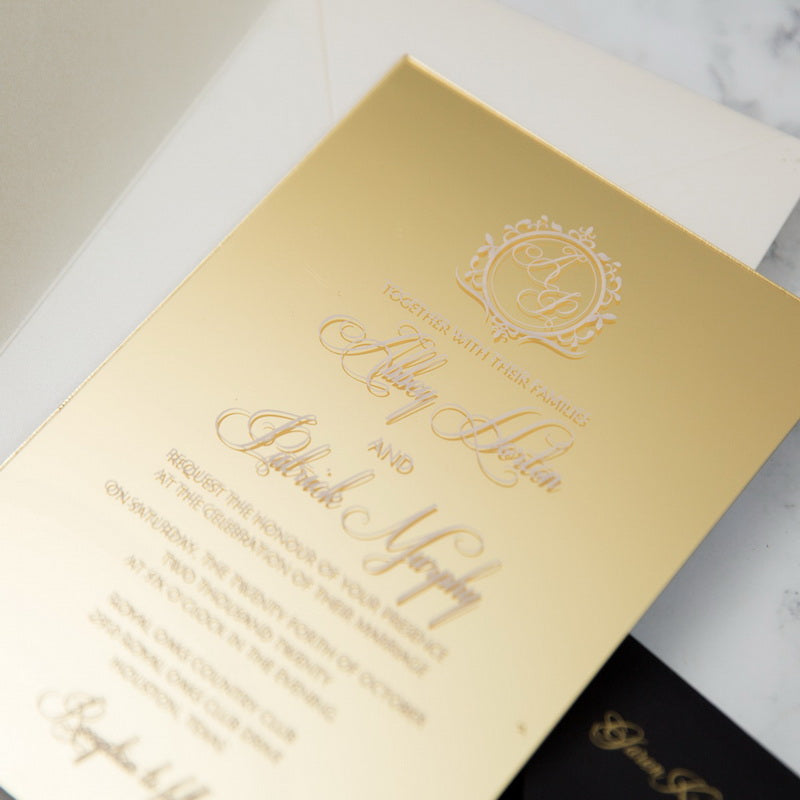Le faire-part acrylique capte l’œil comme une pièce bijou : il joue avec les reflets, magnifie les dorures et transforme l’annonce de votre mariage en un objet précieux.